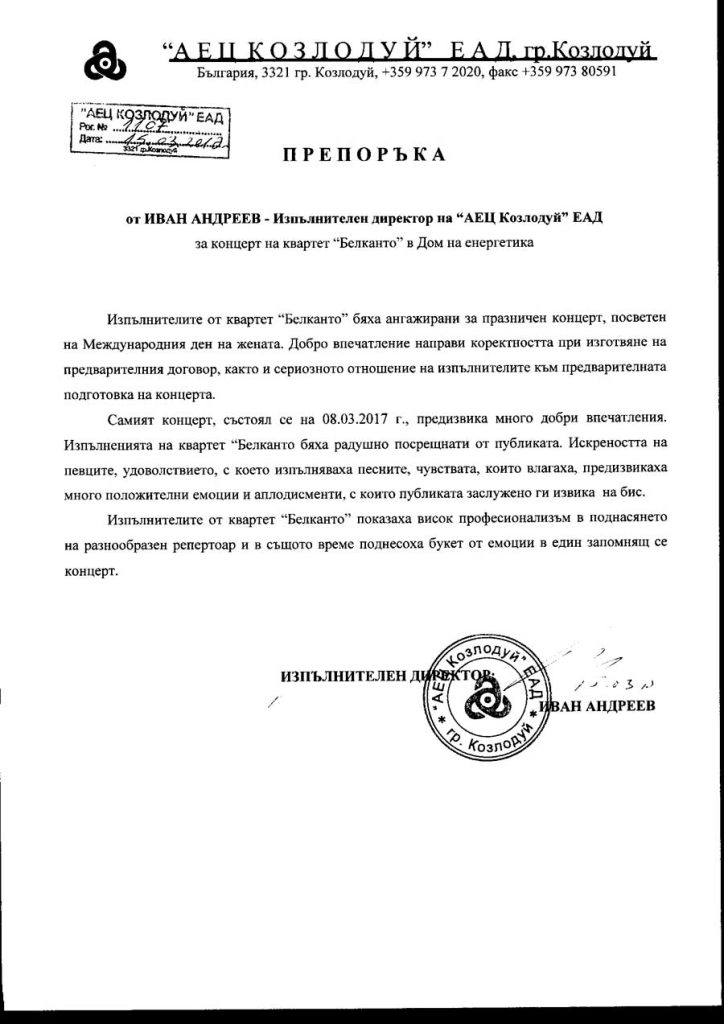 Съвместната ни работа с квартет „ Белканто“ ни дава основание да дадем висока оценка за качеството на тяхната работа.