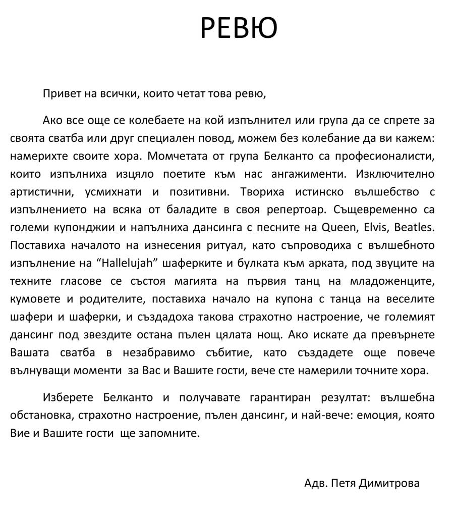 Ако все още се колебаете на кой изпълнител или група да се спрете за своята сватба или друг специален повод, можем без колебание да ви кажем: намерихте своите хора. Момчетата от група Белканто са професионалисти, които изпълниха изцяло поетите към нас ангажименти. Изключително артистични, усмихнати и позитивни. Твориха истинско вълшебство с изпълнението на всяка от баладите в своя репертоар. Същевременно са големи купонджии и напълниха дансинга с песните на Queen, Elvis, Beatles. Поставиха началото на изнесения ритуал, като съпроводиха с вълшебното изпълнение на “Hallelujah” шаферките и булката към арката, под звуците на техните гласове се състоя магията на първия танц на младоженците, кумовете и родителите, поставиха начало на купона с танца на веселите шафери и шаферки, и създадоха такова страхотно настроение, че големият дансинг под звездите остана пълен цялата нощ. Ако искате да превърнете Вашата сватба в незабравимо събитие, като създадете още повече вълнуващи моменти за Вас и Вашите гости, вече сте намерили точните хора.
