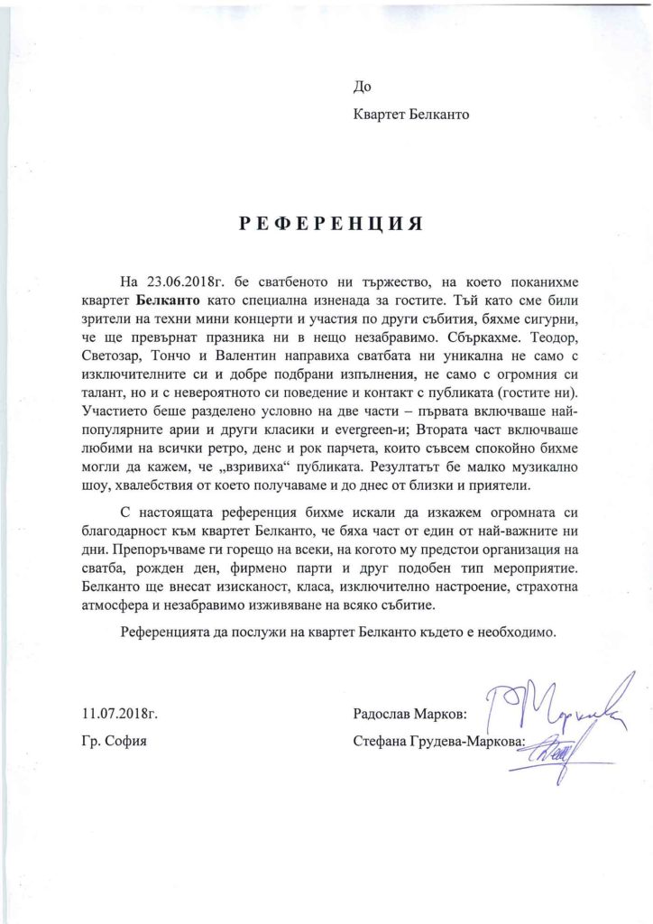 С настоящата референция бихме искали да изкажем огромната си благодарност към квартет Белканто, че бяха част от един от най-важните ни дни. Препоръчваме ги горещо на всеки, на когото му предстои организация на сватба, рожден ден, фирмено парти и друг подобен тип мероприятие. Белканто ще внесат изисканост, класа, изключително настроение, страхотна атмосфера и незабравимо изживяване на всяко събитие.