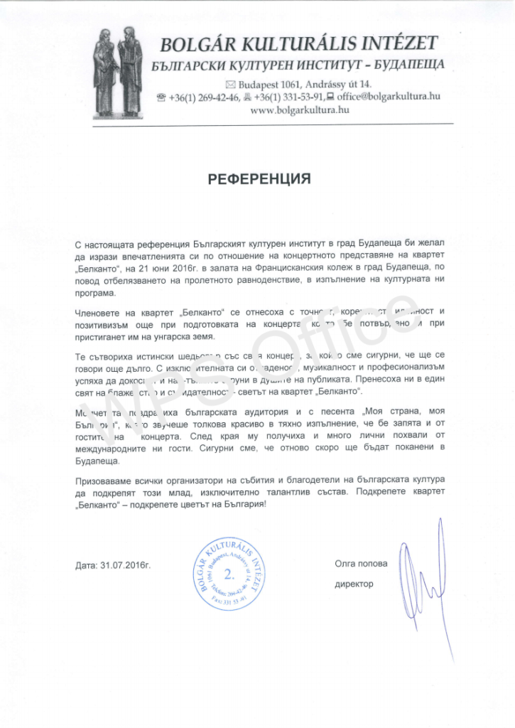 C настоящата референция Българският културен институт в град Будапеща би желал да изрази впечатленията си по отношение на концертното представяне на квартет „Белканто“, на 21 юни 2016г. в залата на Францисканския колеж в град Будапеща, по повод отбелязването на пролетното равноденствие, в изпълнение на културната ни програма.