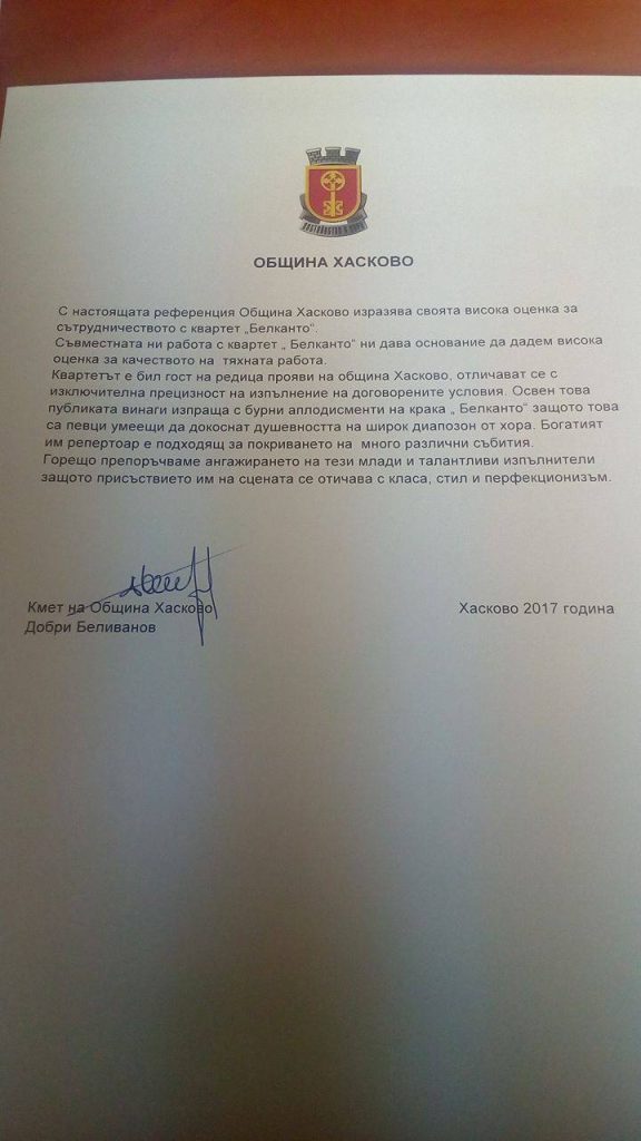 С настоящата референция Община Хасково изразява своята висока оценка за сътрудничеството с квартет „Белканто”.