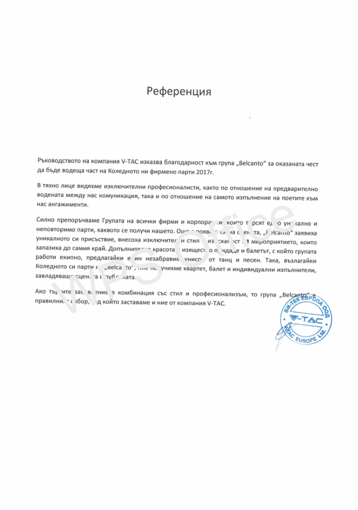 Ръководството на компания V-TAC изказва благодарност към група „Belcanto” за оказаната чест да бъде водеща част на Коледното ни фирмено парти 2017г.